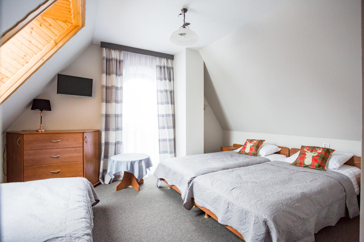 Komfortowo urządzony pokój trzyosobowy, dysponuje telewizorem i łazienką, posiada 3 łóżka pojedyncze.