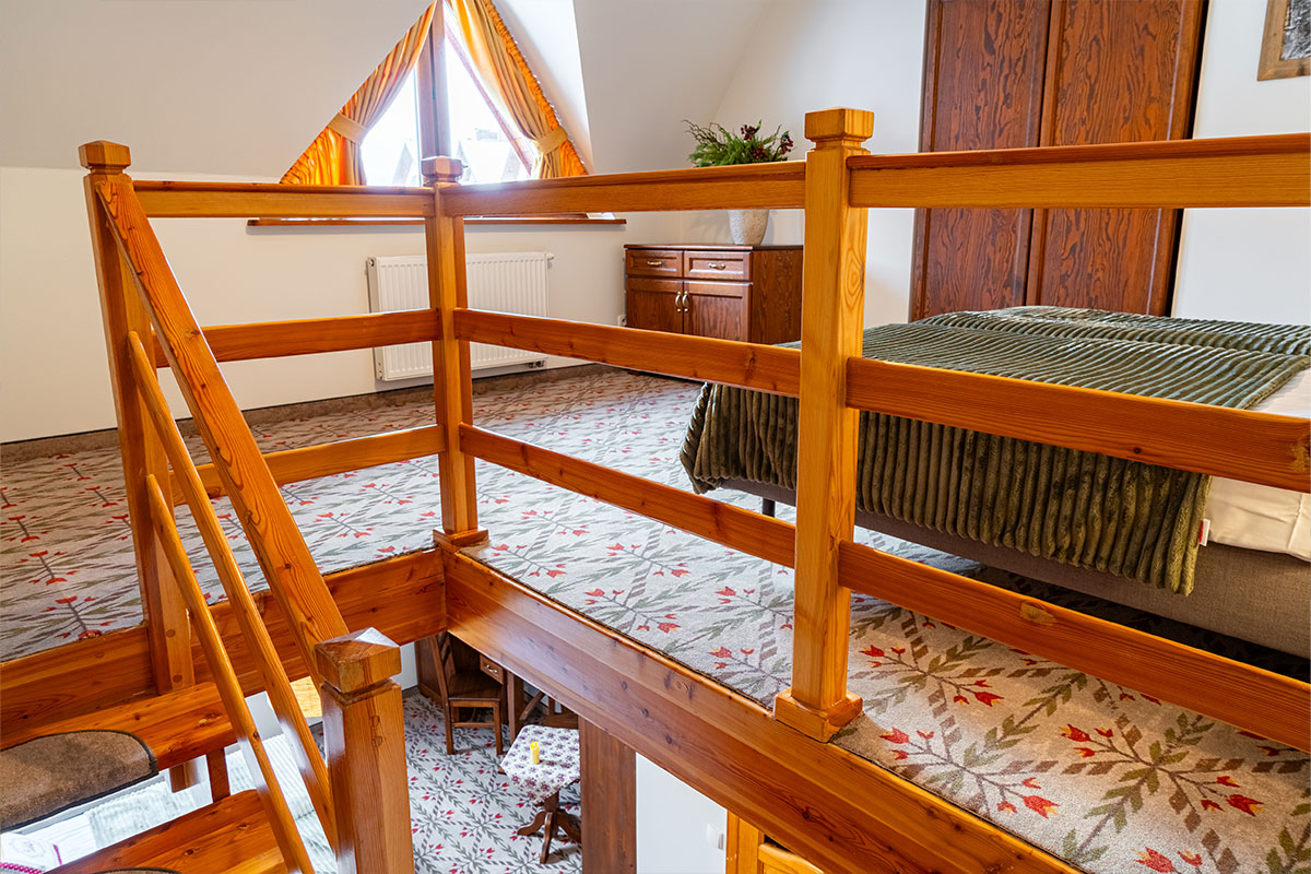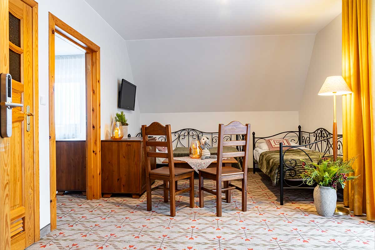 Apartament to funkcjonalne studio składające się z 2 pokoi. Pierwsza część służy jako sypialnia, z której rozpościera się widok na panoramę Tatr lub plac zabaw z ogródkiem. Druga część to salon z miejscem do spania, które może służyć jako pokój do rodzinnego spędzania czasu lub do spotkań biznesowych.